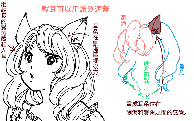 另外,繪製獸耳角色時該不該畫上人類的耳朵也是個問題,這可以配合個人的設定去進行調整。一般來說,選擇用頭髮等蓋住人耳的位置而不繪製的狀況比較常見。