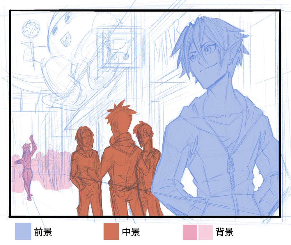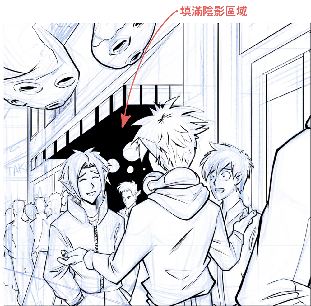 把前景的線稿畫完後,就可以開始描繪中景的線條了。這個步驟中必須留意的是要把中景的線條畫得比前景更細,這麼做能帶出景深與整體環境的遠近感,同時也能把前景與中景區分開來。這樣一來就能幫助讀者分辨,辨識出最接近他們的角色和後方的人群位於不同的平面上。
