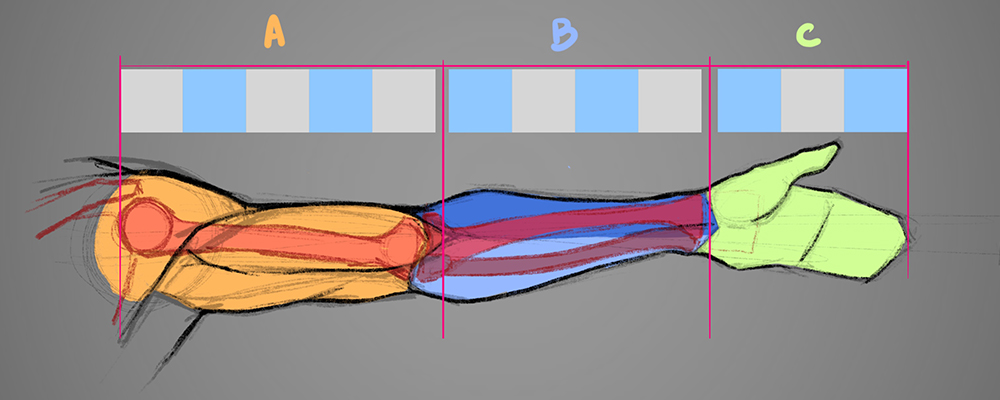 第一個部分是上臂(A),從肩膀到手肘。這個部分以鎖骨為起點,終點和最後一根肋骨在同一個水平面上。第二個部分是前臂(B),從手肘一路延伸到手腕,具體來說就是大腿骨頂端的高度。而第三個部分是手部(C),從手腕到指尖,終點約落在大腿的中間位置。接下來的教學中我會更詳細地為各位解說。