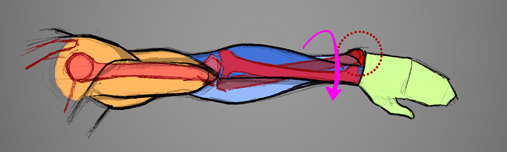 很多時候,手臂會因為有許多動作而很難畫,例如垂直、水平、對角旋轉與旋轉等。這是因為肱骨頂端是圓的,幾乎可以360º旋轉。因此這是畫手臂時的最大難關之一。就讓我介紹各位一些旋轉動作,幫助大家解決插畫中的這些問題。請仔細觀察旋轉手腕時,橈骨是如何轉到尺骨上方的。