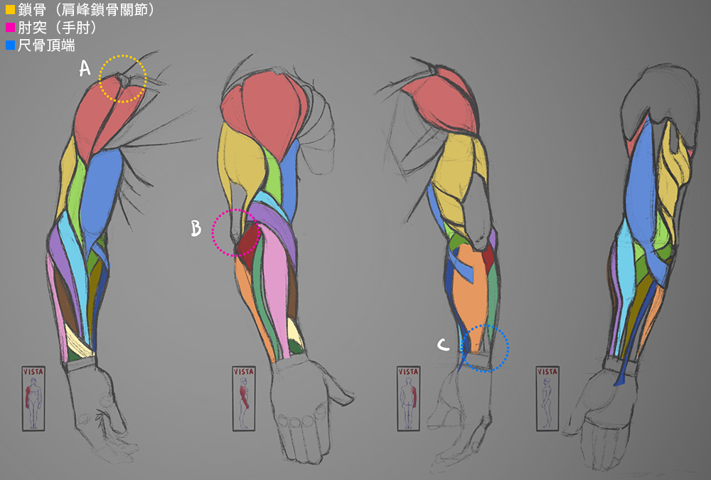 在畫手臂構造時可以加上透過皮膚所觀察到的骨頭或皮下凹點構成的線條來輔助,例如鎖骨、手肘和手腕的尺骨頂端。