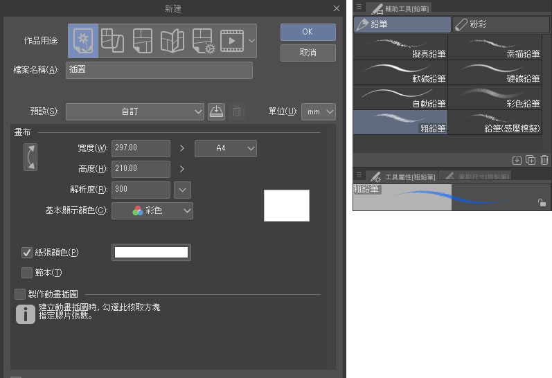 在Clip Studio Paint中新建檔案(檔案→新建→A4畫布,橫向,白色),然後選擇鉛筆工具粗鉛筆,把它的顏色設為藍色,用來描繪草圖。