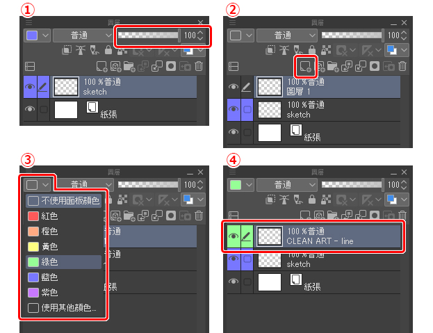 現在,草稿完成後就可以著手清理線條並完成線稿。請先降低草稿圖層的不透明度,如圖(1)般,大約調整至20%~30%就可以了,然後點擊圖(2)中的按鈕建立一個新圖層。在這裡有個訣竅,可以如圖(3)透過變更圖層的面板顏色來快速區分不同圖層。最後,如圖(4)雙擊圖層名稱後將其改名為「clean art」, 讓你能輕鬆辨別清理後的圖層。