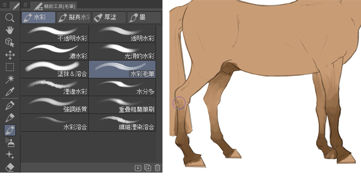 如你所見,我會從腿部開始著色,接著是口鼻和鬃毛,後兩者的顏色會比腿部深。