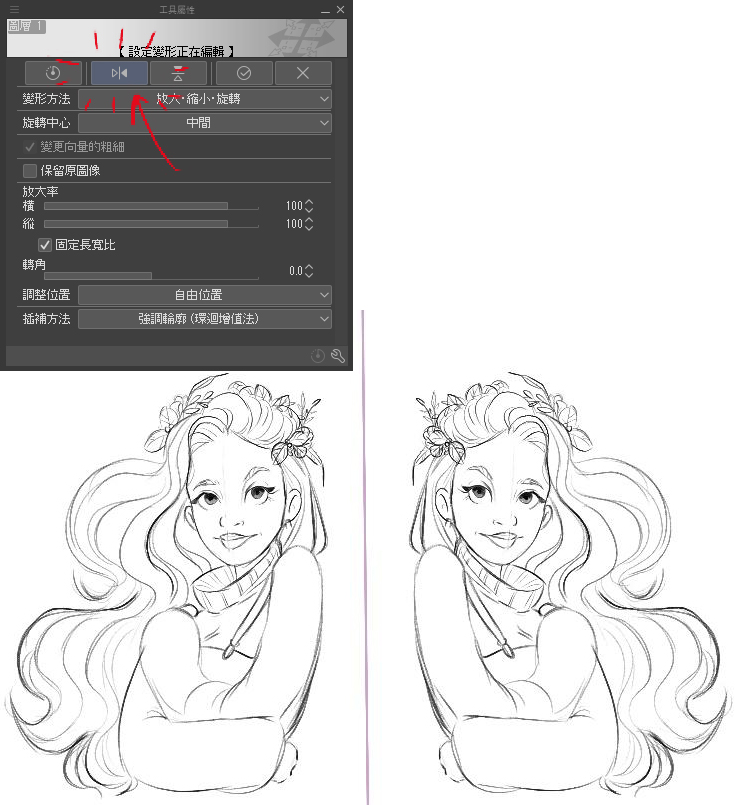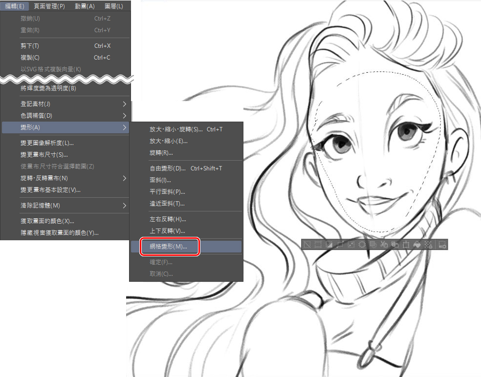 在繪製草稿時,我喜歡根據需要,使用一些工具來調整插圖,例如左右反轉畫布,變形工具和網格變形等。使用這些工具有助於我繪製出正確的比例和想呈現的視角。網格變形可以這樣操作:編輯選單→變形→網格變形。