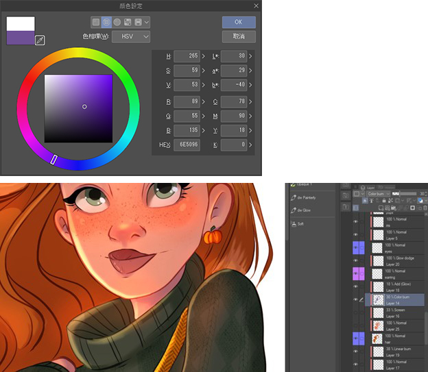 活用圖層功能非常地重要,請盡量避免把所有東西全繪製在同一個圖層上。為了掌握圖層的使用方法,最好能先熟悉[用下一圖層剪裁]、[選擇範圍]工具,以及圖層混合模式等功能。