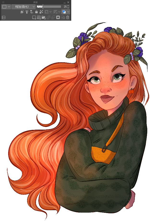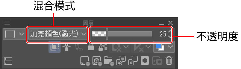 當繪製完所有範圍後,就可以在混合模式中選擇最適合插圖的效果套用。而示範中,我選擇加亮顏色(發光)並把不透明調整為25%。