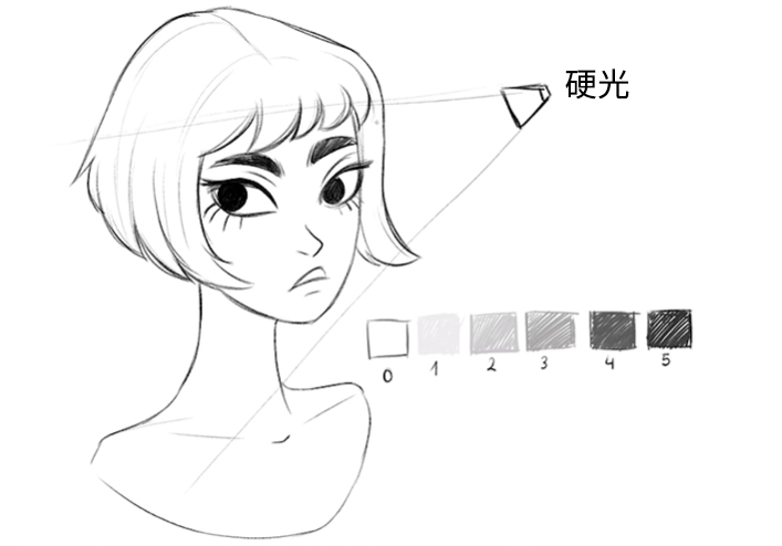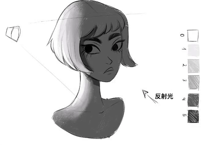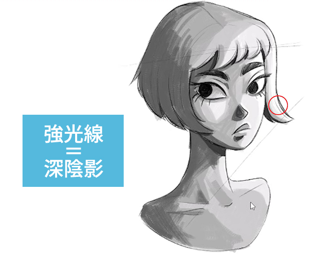 如下圖所示,相較於受光面,陰影與光源的距離更遠。另外,為了加強插圖的深度,我們需要為較凸出的部分添加陰影效果,例如頭髮、下巴、鼻子或下唇。