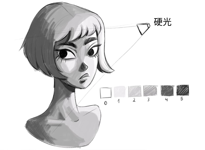 在解說照明和陰影前,讓我們先準備一個至多6階的灰階色票,你可以在熟悉應用後再添加更多的色階。我會先以硬光為例來介紹照明,因為它比較淺顯易懂,一旦熟悉硬光的處理方法,環境光也會變得更容易理解。