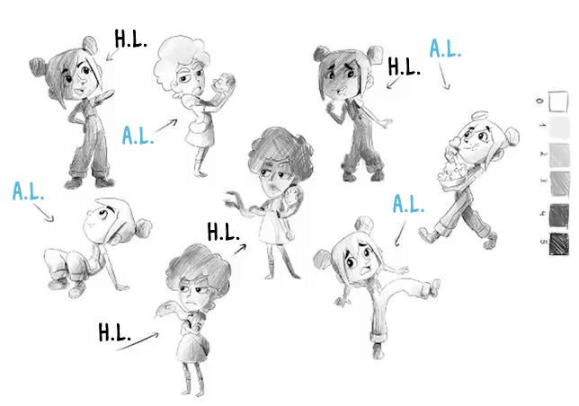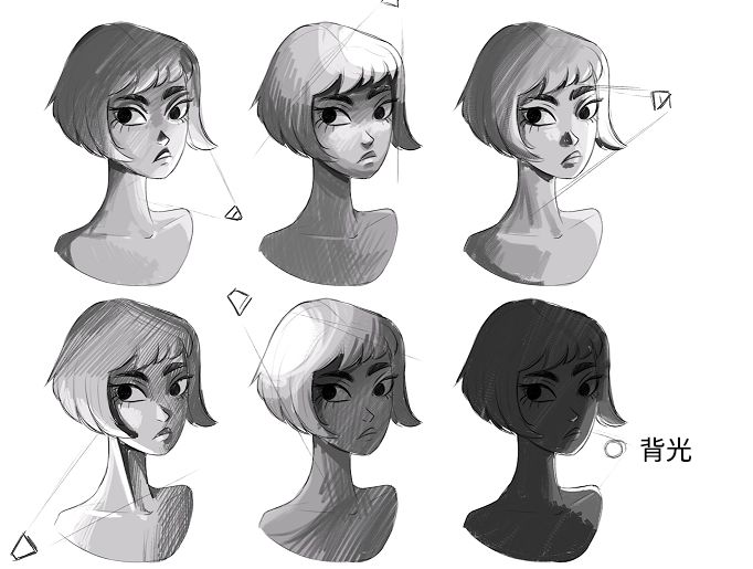 對我而言,如果只是臨摹姿勢或照片,我會很快地失去動力,但我很喜歡用下圖這種簡單的角色插圖表來練習照明的繪製技巧。你可以試著在網路上搜尋自己喜歡角色的各種姿勢,並嘗試將光源置放在不同的位置,僅以鉛筆進行上色,練習對應的各種照明呈現。