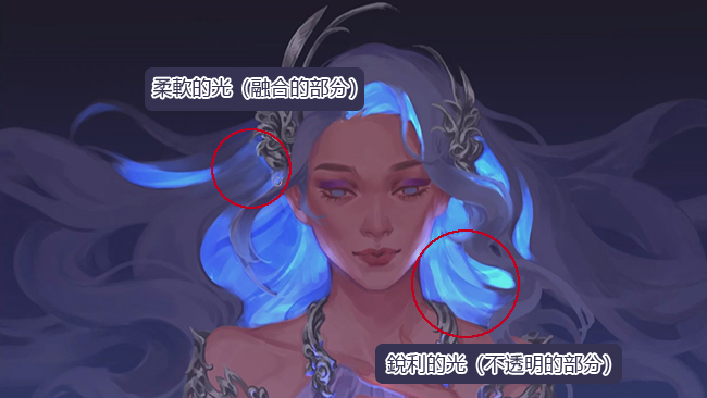 在前一個步驟裡,圖像的對比度非常低,所有顏色的數值都在色環的下半部。也就是說比起白色更接近黑色。我為發光的要素預留了色環較高處的範圍。它會構成發光強度較大的部分。繪製柔軟部分的光芒時可以吸取發光的光源,讓它擴散到周圍。最簡單的方法是全部都用噴槍塗抹,但為了讓作品更上一層樓,需要留意衣服、髮絲、皮膚等光線會遮擋部分光線的素材。