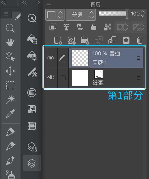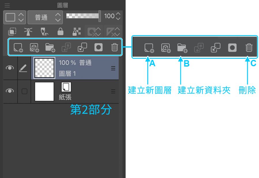 第2部分裡則可以進行基本的圖層管理(選項包括追加、資料夾、刪除等)。對我們來說,目前較實用的選項分別為建立新圖層、建立新資料夾,還有刪除圖層的功能。