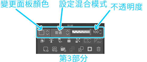 第3部分,變更圖層的面板顏色(請注意,這個選項只能用來區分圖層,並不會改變插圖的顏色)、設定圖層的混合選項和變更不透明度。