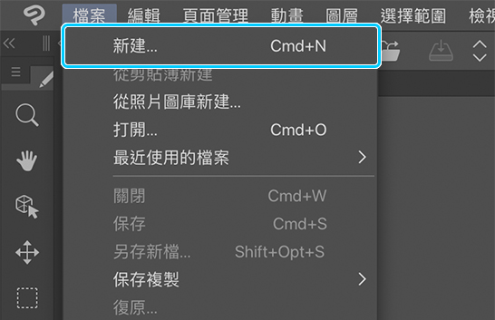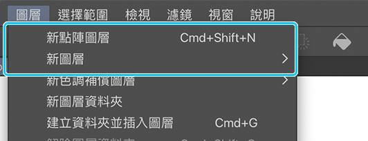 建立新圖層的方法共有三種。可以單擊[圖層]視窗裡的圖示,或是通過選擇[圖層]選單>新點陣圖層來建立圖層。另一方面,如果要建立其他類型的圖層(如網點圖層),則需要選擇[圖層]選單>新圖層>網點。