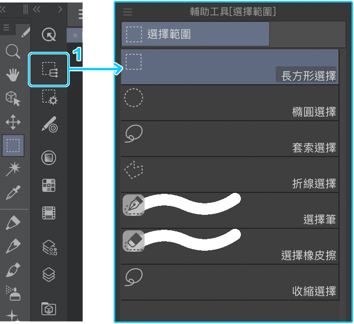 點選(1)後,可以選擇其他不同類型的輔助工具。初始設定的[長方形]輔助工具可以建立正方形或長方形的範圍,你還可以使用以下類型的輔助工具來選擇各種範圍:[橢圓]橢圓、[套索]自由形式、[折線]多邊形。另外,[選擇筆]輔助工具可以將你塗抹的部分指定為選擇的範圍,[選擇橡皮擦]輔助工具則可以通過橡皮擦功能,取消透過其他輔助工具塗抹、選擇的範圍。最後一個[收縮選擇]輔助工具,可以圈選出已描繪或上色的範圍,但是請注意,如果沒有圈選完整,將無法選擇圖中的任何範圍。