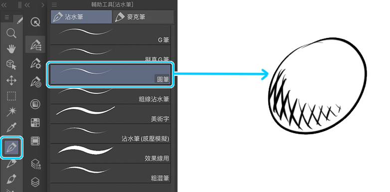 然後我要將工具變更為圓筆,用它來繪製細節。圓筆能繪製更細的線條,可以精確地描繪眼睛或頭髮的細節。