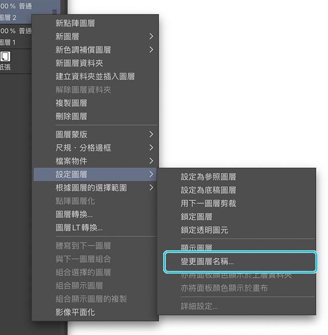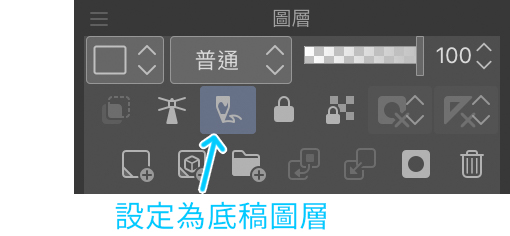 為了完成圖層的設定,我得將它設定為底稿圖層。請點擊側邊面板中的圖層圖示,在圖層的選單中長按圖層,然後在出現的選單中選擇設定圖層>設定為底稿圖層。另外一種較為簡單的做法是直接點選下圖的[設定為底稿圖層]圖示。