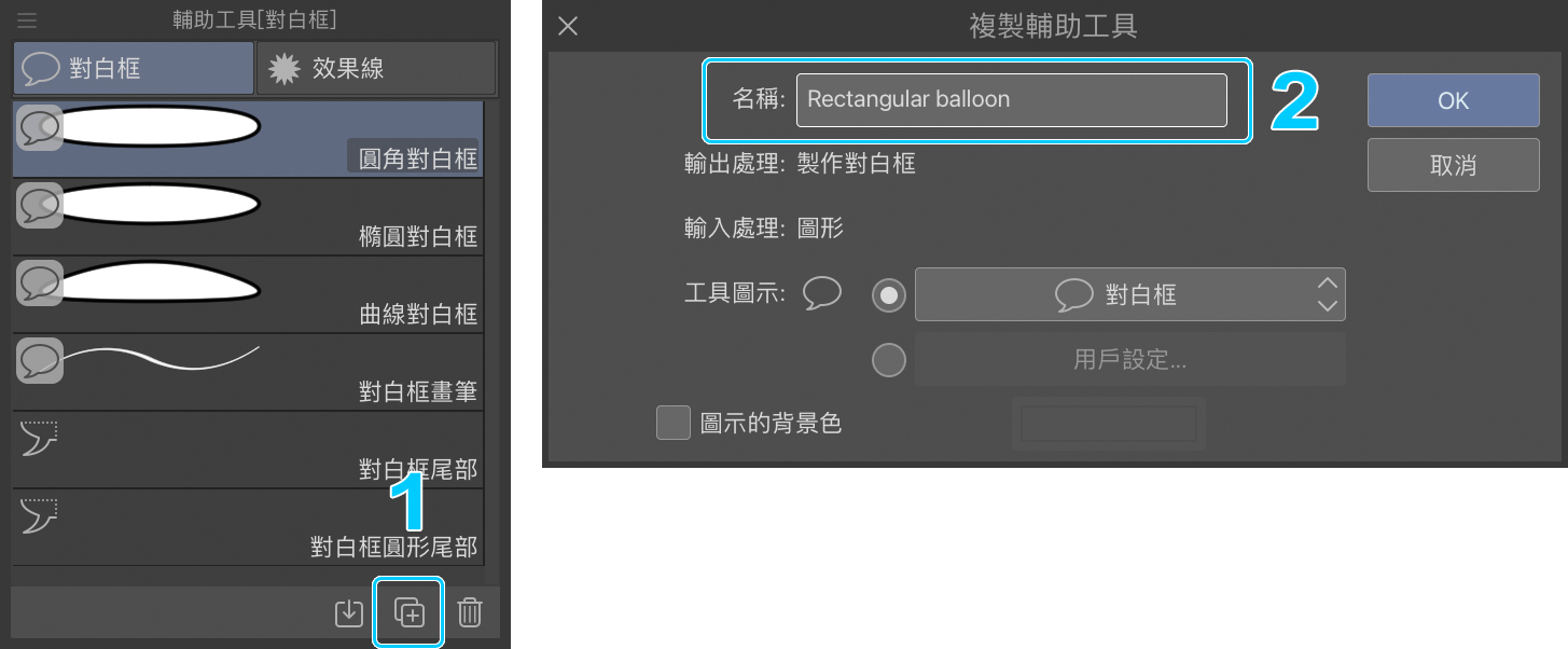 接下來,選擇對白框輔助工具,並在設定畫面中變更對話框的設計,我選擇橢圓對白框。我也經常在Instagram上使用正方形或長方形的對白框。如果要建立一個新的形狀,只需按一下輔助工具視窗底部的圖示(1)。在(2)的位置更改名稱,點選OK後,就能變更工具的設定。現在,你可以使用手寫筆來繪製對白框。