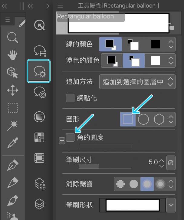 如果想要建立長方形的對白框,請取消勾選角的圓度選項。