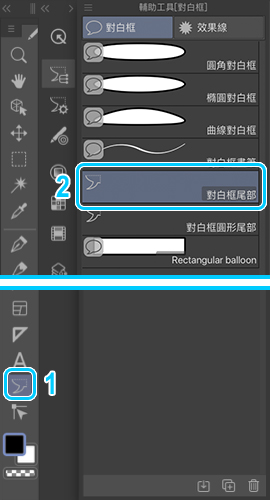 最後,我會在對白框輔助工具中選擇對白框尾部,將對白框的的尾部與發言的角色進行連結。你可以選擇普通的對白框尾部或圓的尾部(思考的對白框尾部效果),而我通常使用手寫筆繪製尾部。