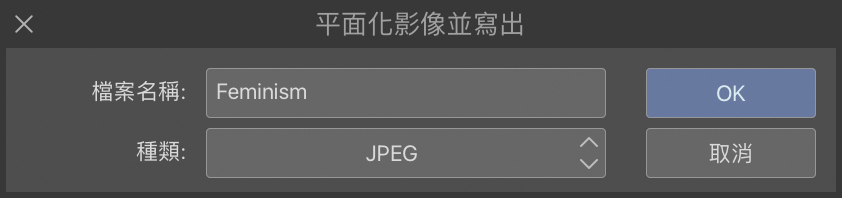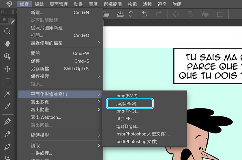 最後,要寫出作品,用來進行網路公開。這時候我該選擇:檔案>平面化影像並寫出> .jpg(JPEG)。