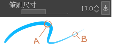 ・筆刷尺寸:線條的粗細取決於筆刷的尺寸,以及繪圖時施加在繪圖板上的筆壓。(A)為筆刷最寬的尺寸,(B)為最小筆壓下的寬度。