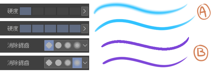 ・硬度/消除鋸齒:這些設定可以柔化筆刷邊緣,下面可以看到兩種設定會如何影響筆刷的呈現。(A)硬度/ (B)消除鋸齒。