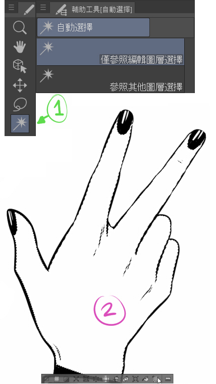 (1)點選自動選擇工具 > (2)點選手後,手部會出現虛線輪廓 > (3)反轉選擇範圍 > (4)選擇頭髮的圖層後建立圖層蒙版。