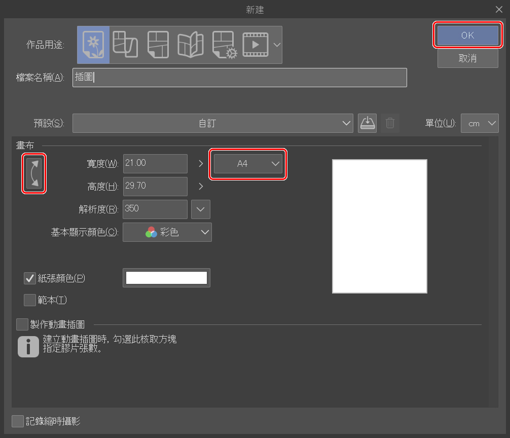 首先,開啟Clip Studio Paint(之後簡稱CSP)並建立一個新檔案。示範中,我建立了一個A4大小的畫布。