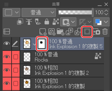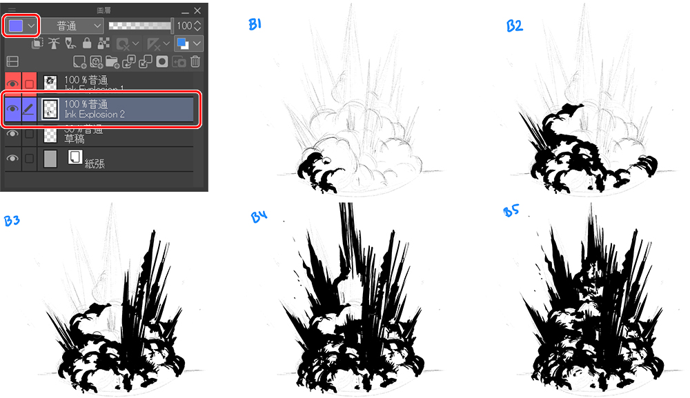 我會以相同的步驟描繪第二種爆破。建立一個新圖層,將其命名為Ink Explosion 2,並將面板顏色變更為藍色。