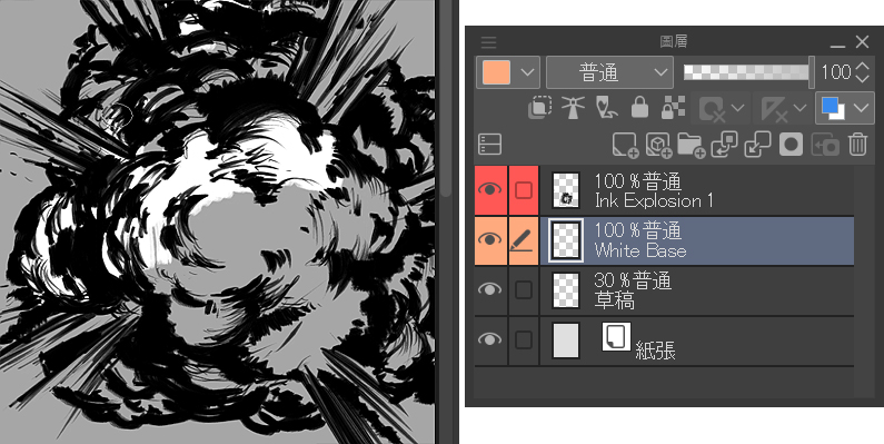 我在Ink圖層的下方加入一個新圖層,用白色進行基礎的平塗,這樣一來,爆炸就會呈現實心的狀態,沒有透明的鏤空部分。我將這個圖層命名為White Base 。