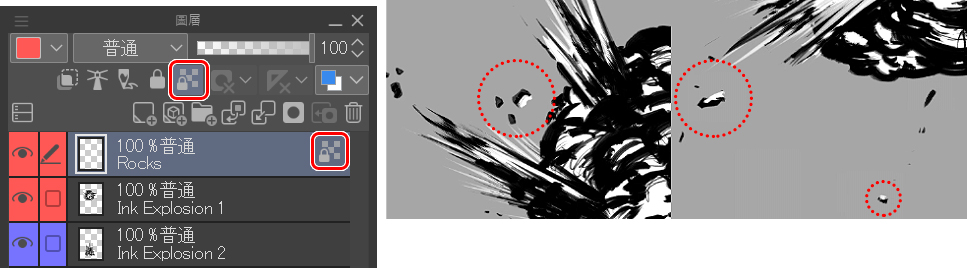 最後,我為碎片添加了亮部。為了完成這個動作,我會單擊下圖的按鈕來鎖定透明圖元,這樣就能在不超出圖層上已繪製部分的狀態下添加亮部。請記住,光源是爆炸本身,因此請在面向火光的那一側添加亮部。