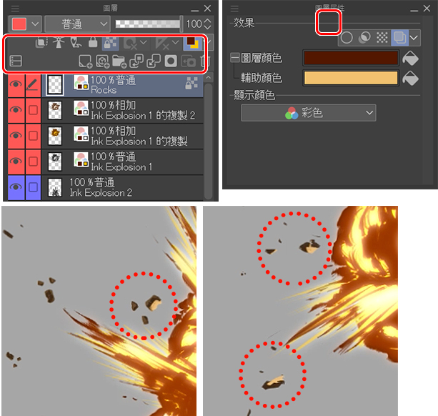 在前進到第4個步驟前,我會添加一些爆炸的碎片來表現威力和真實感,你可以直接在這個圖層上添加,也可以為碎片建立一個新的圖層,我比較建議建立一個新的圖層。新建一個圖層,將其重新命名後變更圖層的面板顏色,然後在火焰的周圍繪製大小不同的碎石。