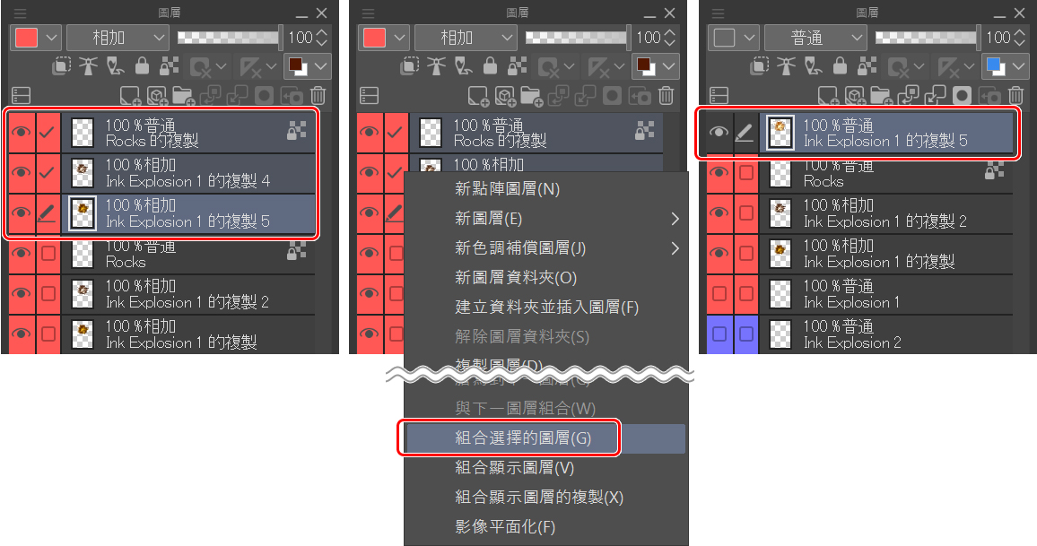 如果要得到下面的效果,需要將圖層合併,但為了保留原來的圖層,最好先複製再進行合併。我要合併Explosion 1的三個圖層。請以Cmd或Ctrl鍵選擇三個對象圖層,然後點選複製圖層。複製完畢後,將它們合併為一個圖層。