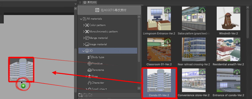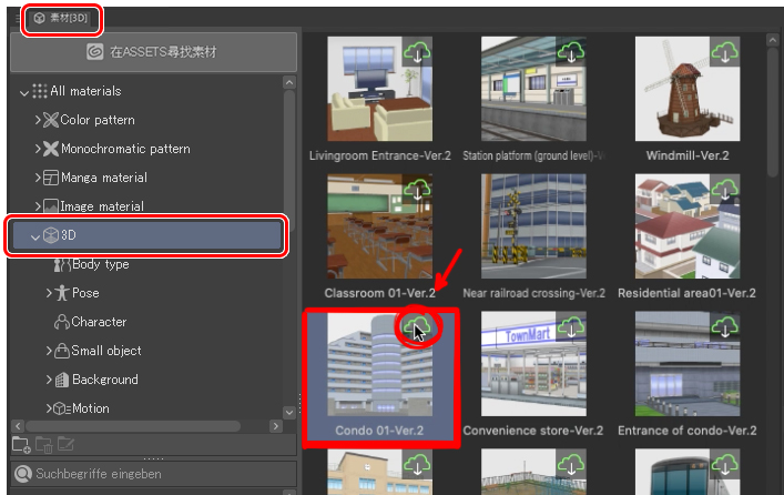 請開啟素材(3D)面板,在Clip Studio的素材中尋找你喜歡的場景,並點擊它免費進行下載。