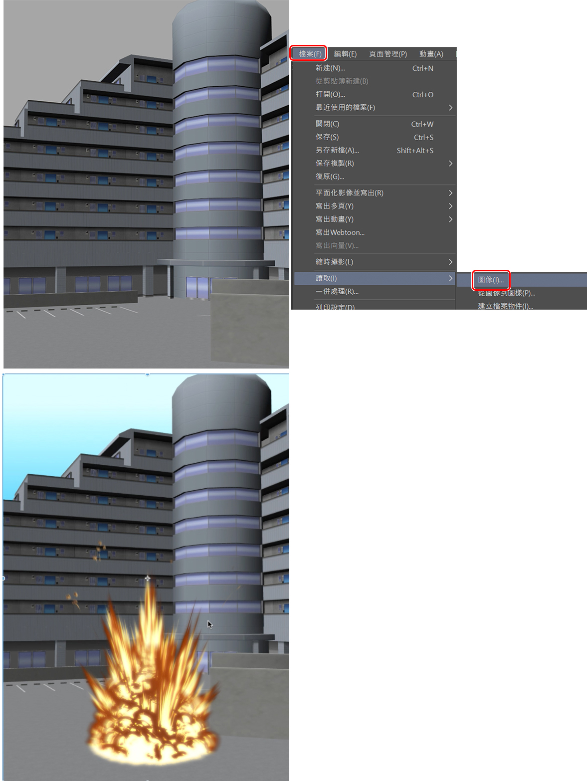 把場景調整成喜歡的角度之後,加入(檔案>讀取)之前保存的爆炸PNG檔案。