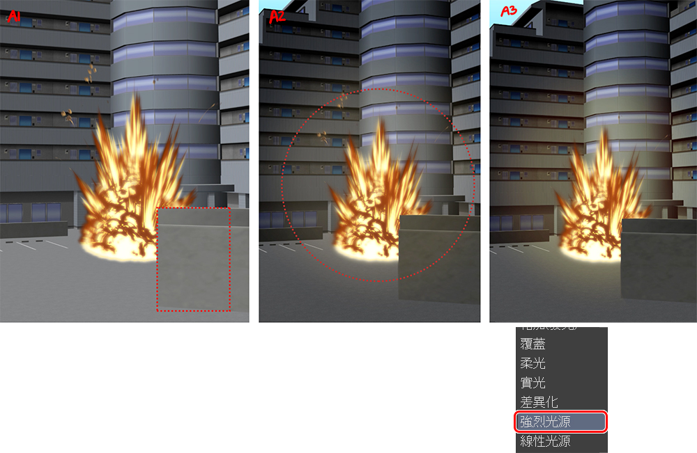 這邊,我將爆炸安排在停車場內,並擦除前方牆面範圍的爆炸效果(A1)。然後在新的圖層上使用柔軟噴槍工具(A2),為火焰添加光暈效果。之後,我將圖層混合模式更改為強烈光源(A3)。
