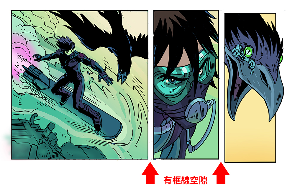 拿掉框線往往會讓兩個分格的內容混在一起,可能會難以閱讀,或者能呈現兩件事同時發生的感覺。如果我希望引導讀者從一張圖片看到下一張圖片,或凸顯分格之間緊湊的氛圍,可能就會應用重疊的技巧,但不是項簡單的技術,我需要確保一個分格的元素不會和另一個分格混在一起,造成讀者難以掌握頁面的閱讀節奏。