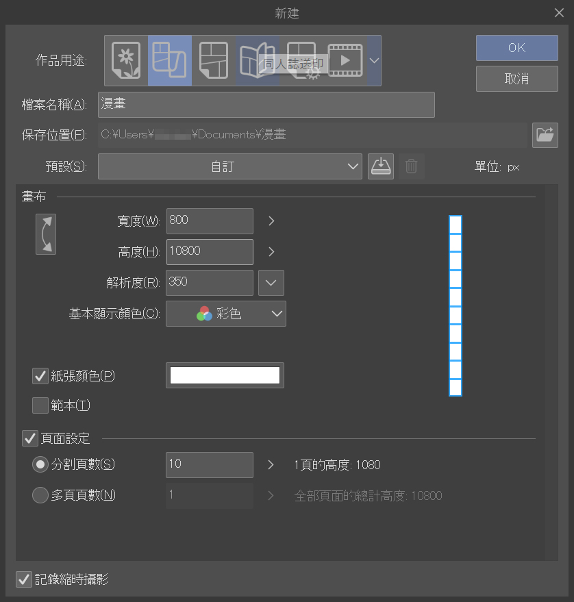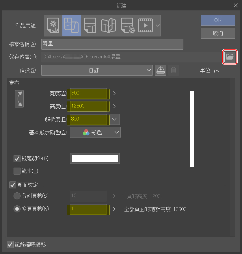 只設定一頁,保持Webtoon的格式。我喜歡掌握長畫布的確切高度,手機螢幕尺寸大多為800×1280,這是製作Webtoon漫畫時必須記住的尺寸,你可以將1280乘以想要的畫布數量,這樣一來,建立畫布時就能獲得確切的尺寸。