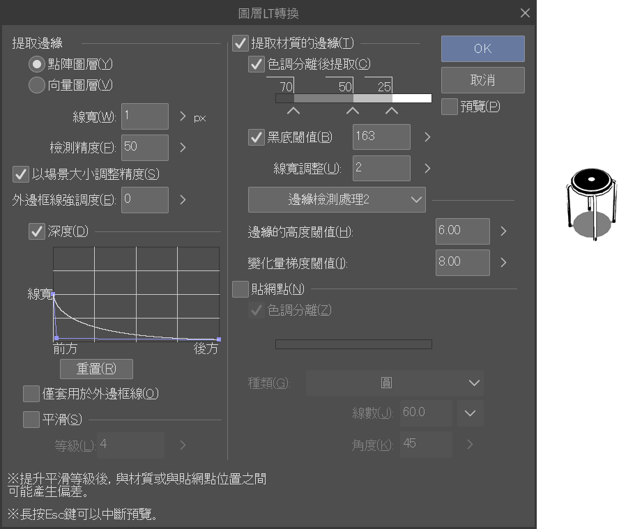 - 一邊預覽一邊更改設定,直到有實線可以描繪。