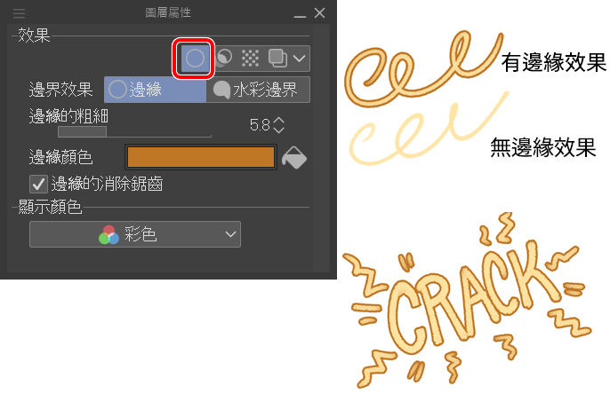 開啟「圖層屬性」視窗並選擇「邊界效果」,設定邊緣的粗細和顏色。