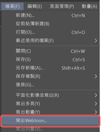 你一定很想知道,為什麼明明可以先切割畫布,我卻還是要用一個長長的畫布來進行作業。這是因為我會在畫布上使用很多空間來處理沒有框架的分鏡,所以我不能從一開始就分割它。值得慶幸的是,有一個叫做為「寫出Webtoon」的選項可以使用,這個選項只有在初始設定為webtoon格式時才會出現。