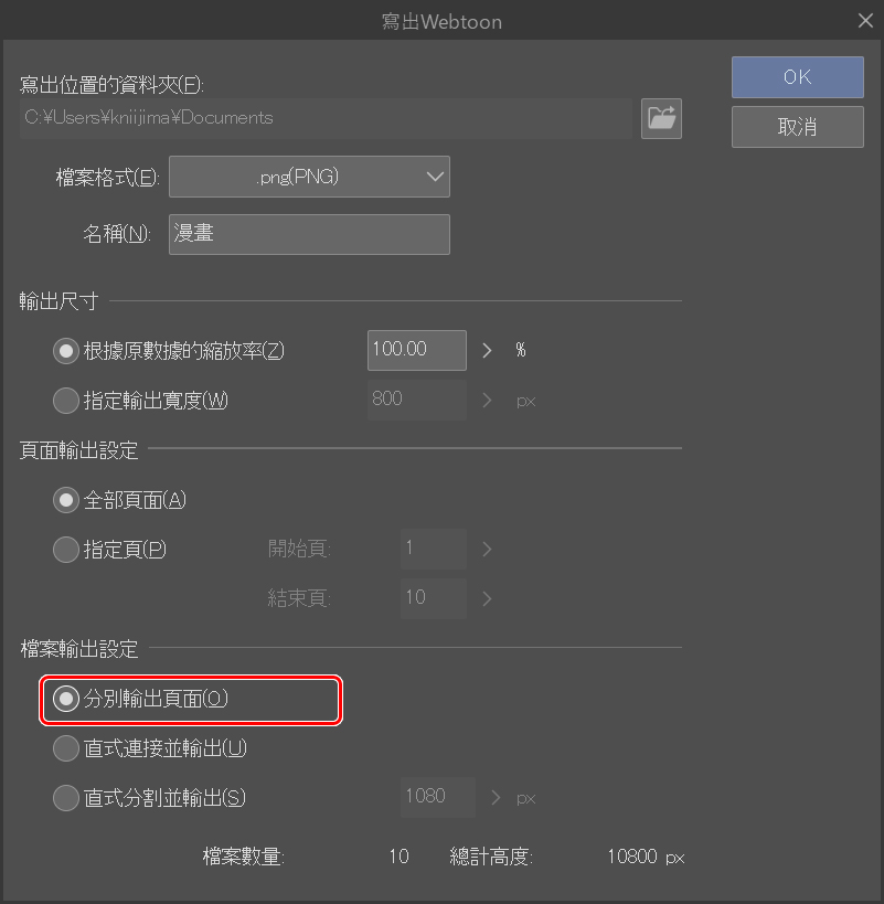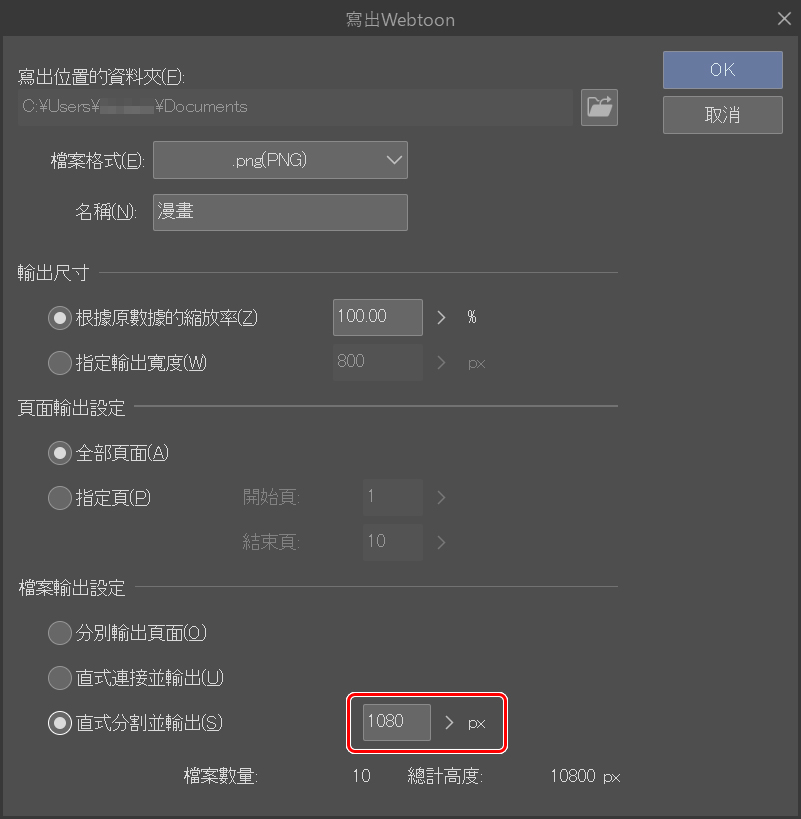 按下這邊可以分割長條狀的畫布。我在開始時計算了10個場景,現在可以把文件寫出成需要的格式了。我將保持相同的設定,只更改分割選項。