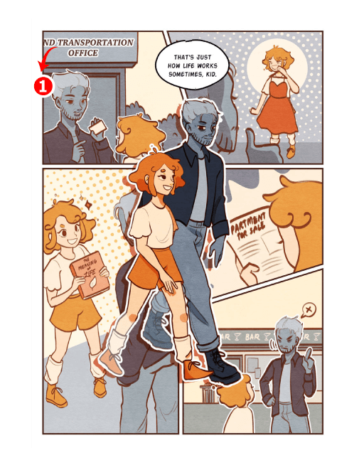 Al ponerme a pensar en el tema, los viajes, me pareció que el proceso de madurar en la vida aportaba profundidad. Como estudiante de instituto, siento que mi relación con mi familia cambia por momentos. Creé a mi protagonista con nuestro gato en mente. Espero que tanto yo como los personajes podamos seguir creciendo a través de su viaje. El plantear una historia, añadir texto y dividir viñetas eran áreas desconocidas para mí. Agradezco a mi familia y amigos todos sus consejos. Ha sido una experiencia increíble. Muchas gracias. Espero poder seguir avanzando en la dirección que me gustaría.