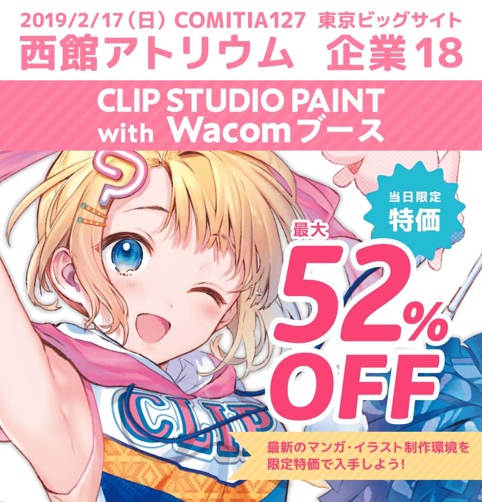 | 日時 | 2019年2月17日(日)12:00~ 第1部 12:00~13:00 CLIP STUDIO PAINT 初級・中級セミナー 基本操作+マンガ制作のポイントをご説明 第2部 14:00~15:00 CLIP STUDIO PAINT 初級・中級セミナー 基本操作+マンガ制作のポイントをご説明 |