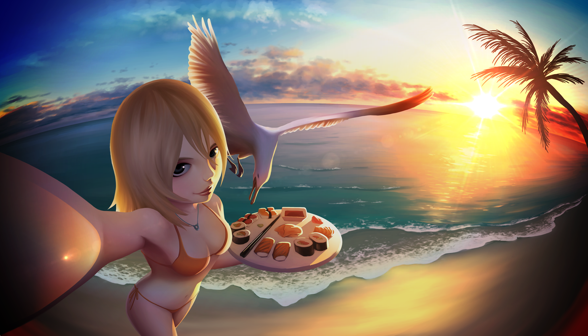 Allison with sushi was not something one could come up with easily. The atmosphere of the illustration is very beautiful and is easy to imagine the theme: tropical summer.