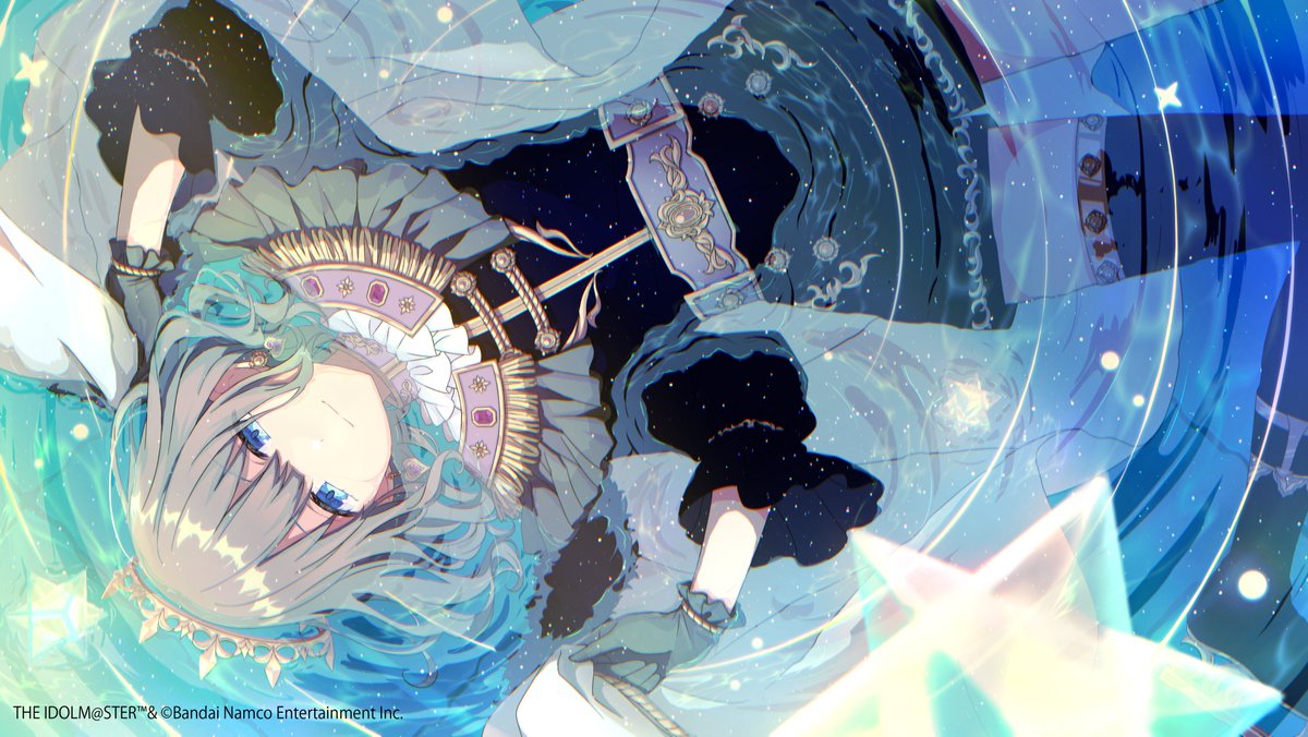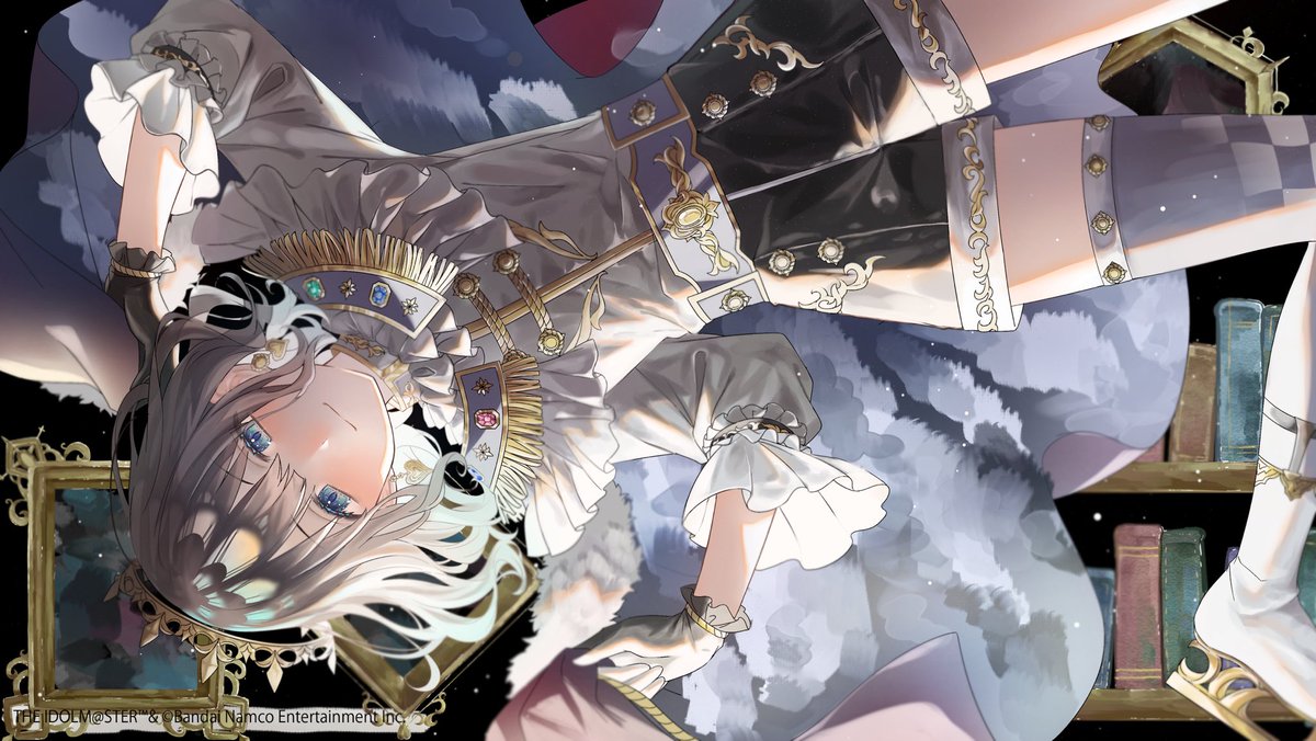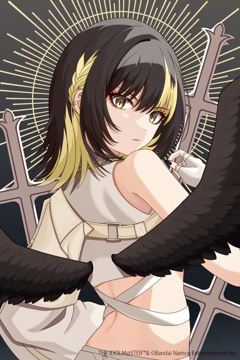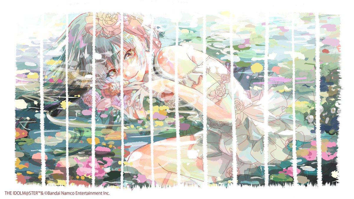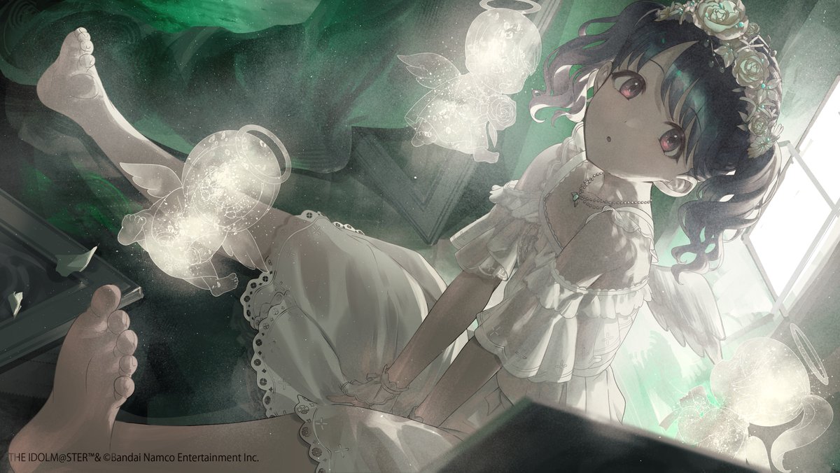 画面全体のざらざらとした筆致が特徴的で、油彩風の重みのある塗りが儚さを感じさせます。透明な天使たちも消え入りそうなイメージで、退廃的な印象が新鮮な一枚です。「シャイニーカラーズ」プロデューサー