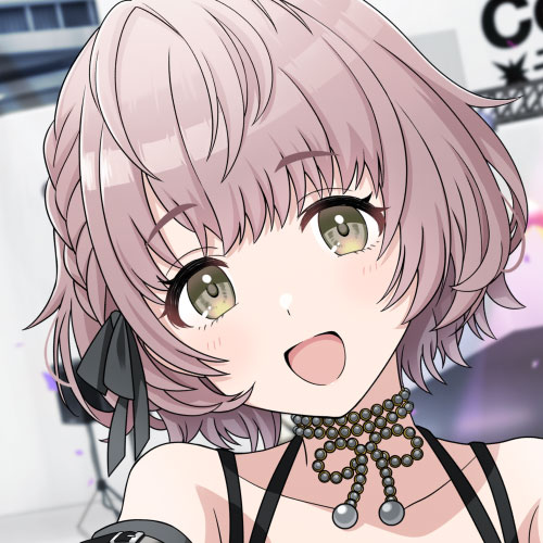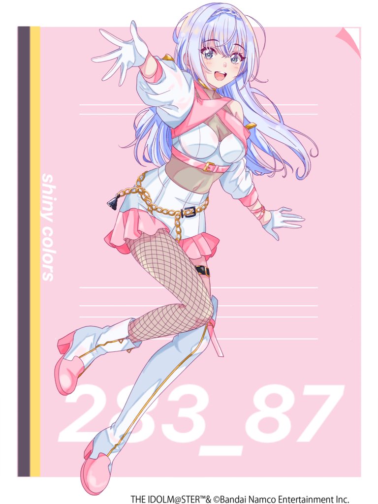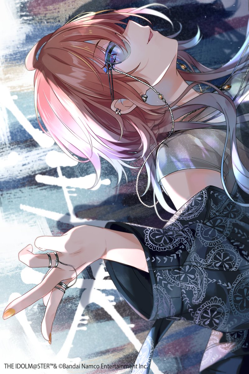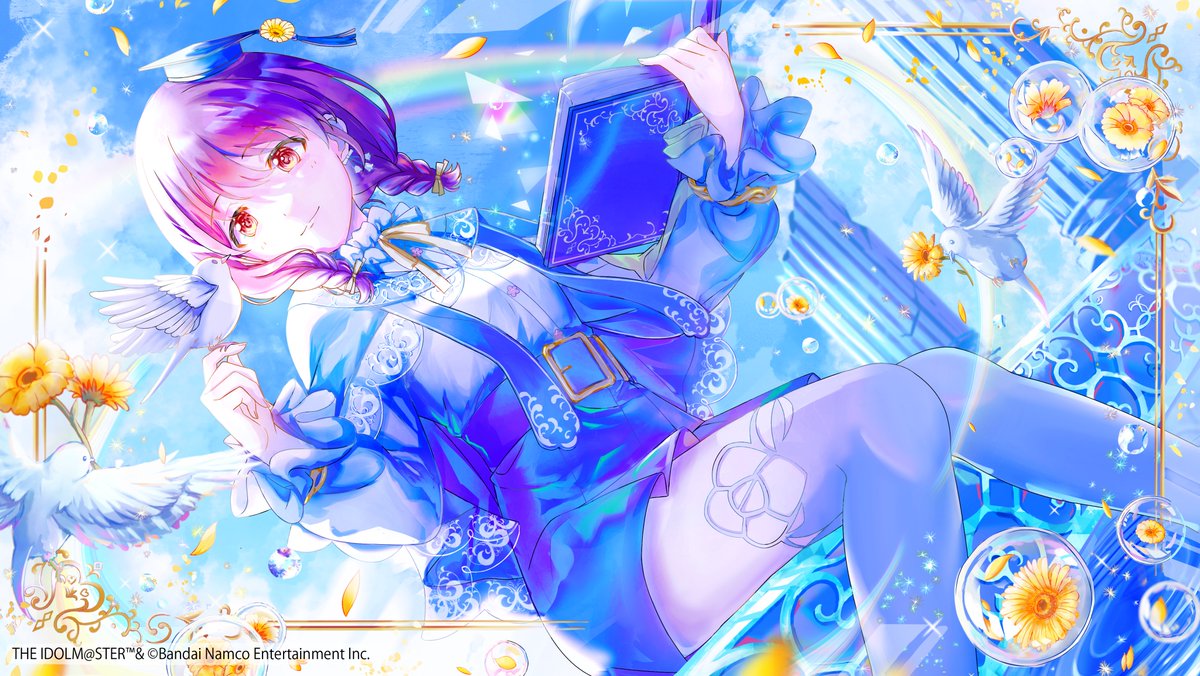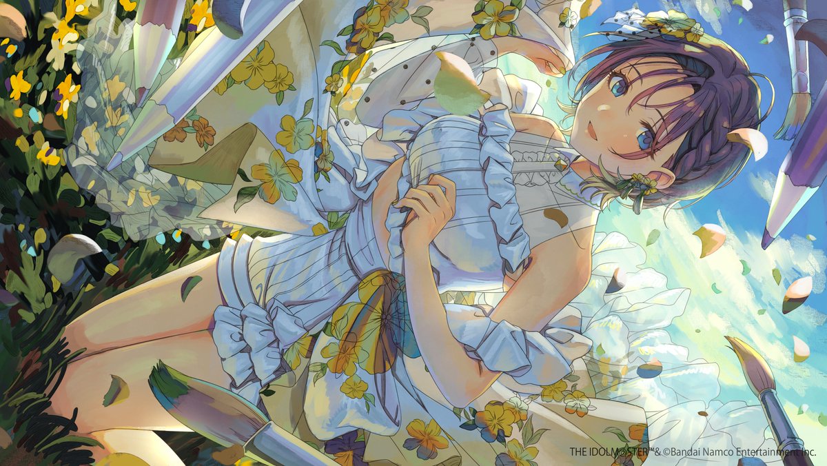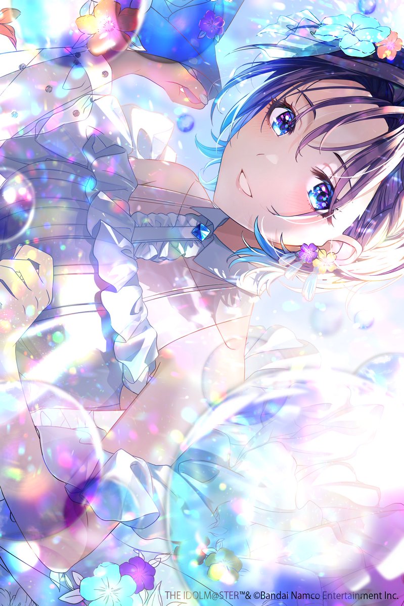 印象的な水彩風のタッチと、ピンクやブルーといった影色での遊びが印象的です。霧子が持つリップが最も彩度が高く、霧子の顔回りの印象が強まるのも工夫されているように思いました。「シャイニーカラーズ」プロデューサー