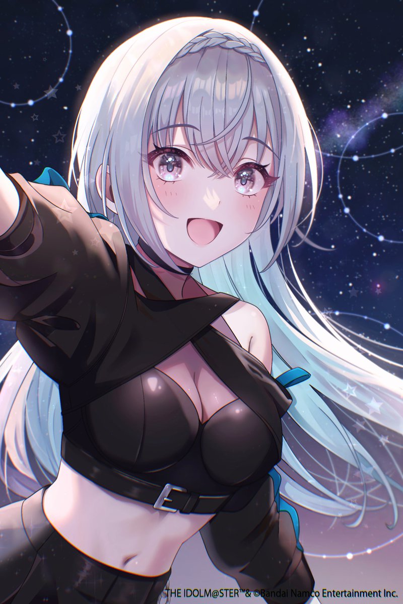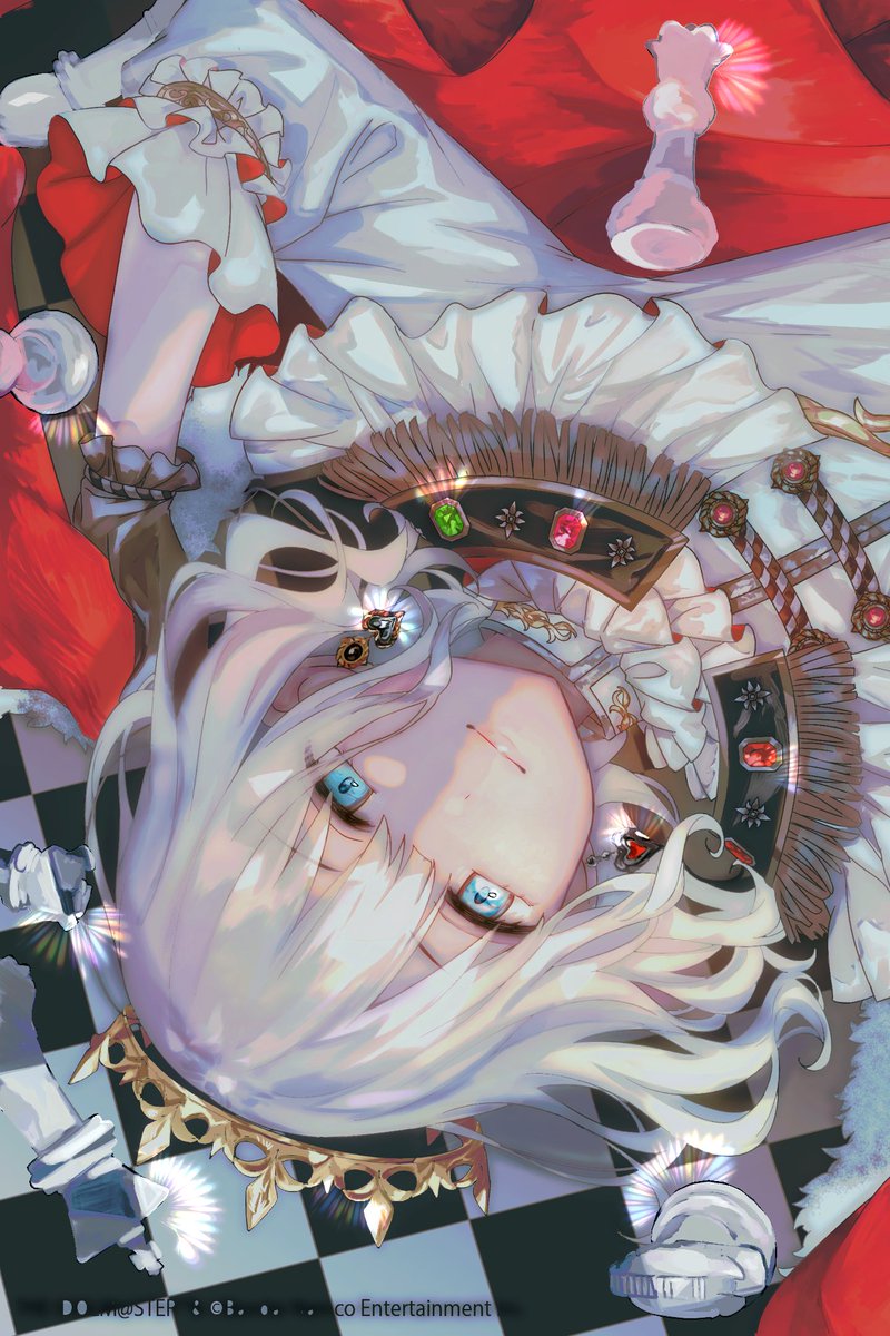 まず目に飛び込むのが瞳の透き通るブルー。まさに吸い込まれそうな印象でそこから宝石の碧・衣装の紅・王冠の金など、色使いが巧みな一枚です。塗りのにじみ感も荘厳な・神々しい印象を生み出しているのかなと感じました。「シャイニーカラーズ」プロデューサー