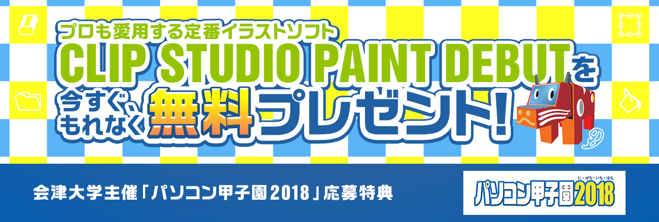 「パソコン甲子園2018」に作品を応募される方に、定番イラストソフト「CLIP STUDIO PAINT DEBUT」をもれなくプレゼント。アンケートに答えるだけですぐに申込めます。